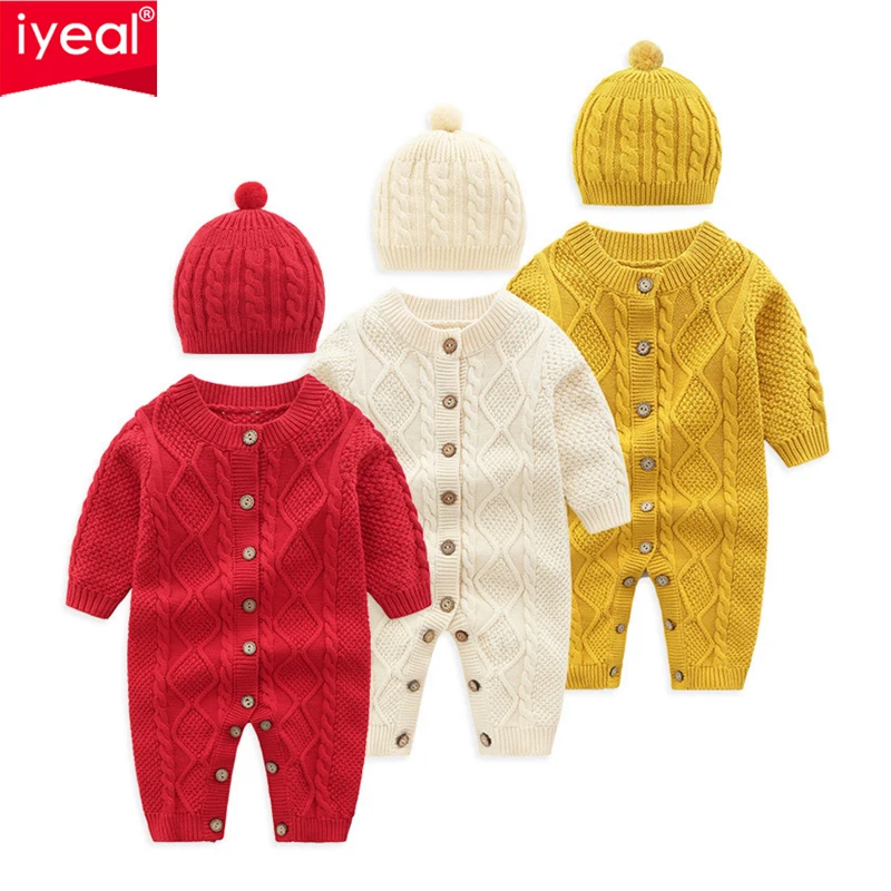 HOT SALE IYEAL Newborn Baby Boy Girl Christmas Costume Cotton Knitted Baby Rompers With Hat 2PCS Winter Craw